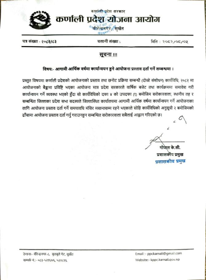 कर्णाली प्रदेश योजना आयोगको आगामी आर्थिक वर्षमा कार्यान्वयन हुने आयोजना प्रस्ताव दर्ता गर्ने सम्बन्धि सुचना ।